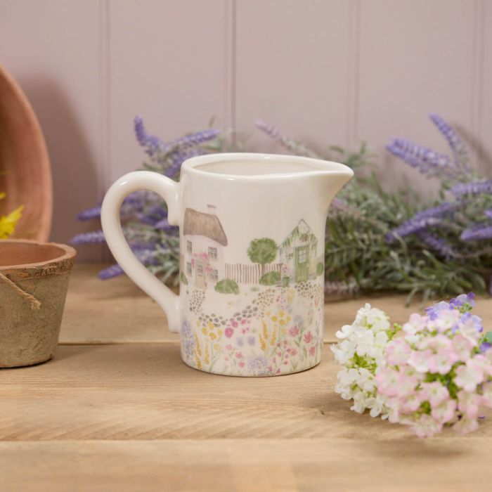 Ceramic jug with a cottage garden thatched cottage scene all the way around.
